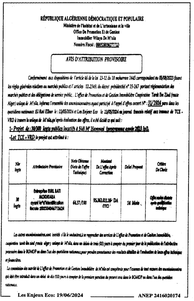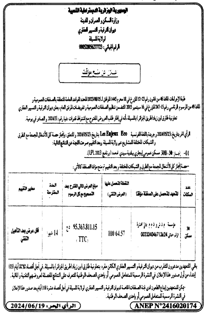 إعلان عن منح مؤقت: انجاز 300/30 مسكن عمومي ايجاري ببلدية سيدي امحمد (برنامج 2023 LPL)/ ديوان الترقية والتسيير العقاري لولاية المسيلة