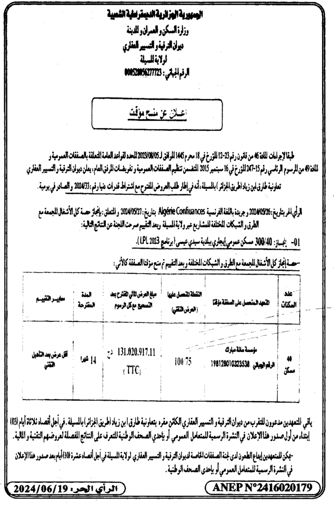 إعلان عن منح مؤقت انجاز 300/40 مسكن عمومي ايجاري ببلدية سيدي عيسى/ ديوان الترقية والتسيير العقاري لولاية المسيلة