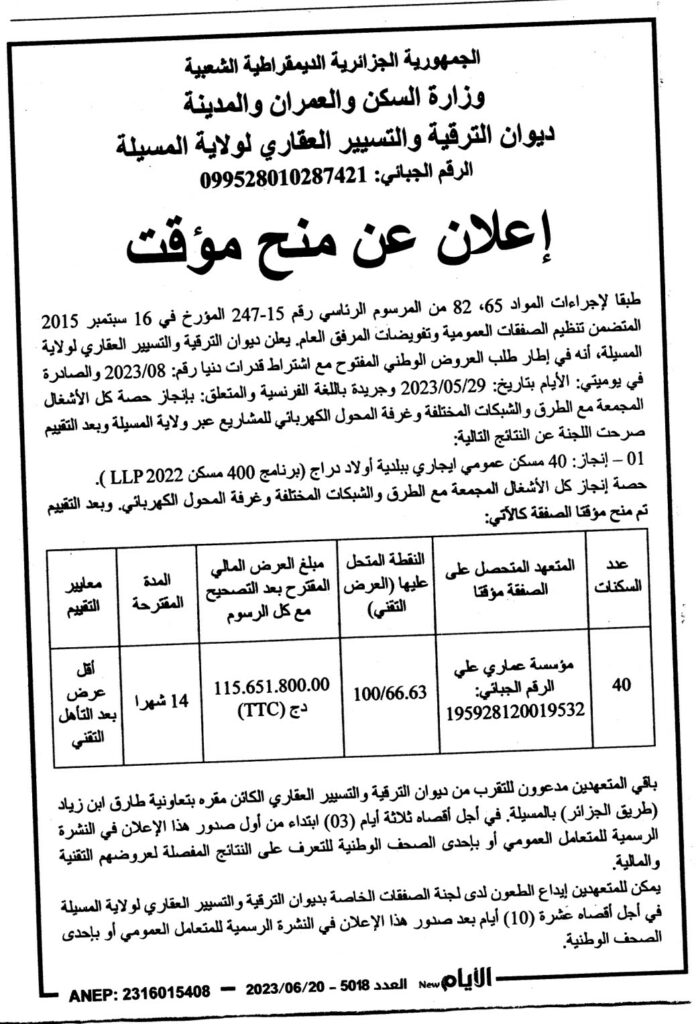 إعلان عن منح مؤقت: انجاز 40 مسكن عمومي ايجاري ببلدية أولاد دراج/ ديوان الترقية والتسيير العقاري لولاية المسيلة