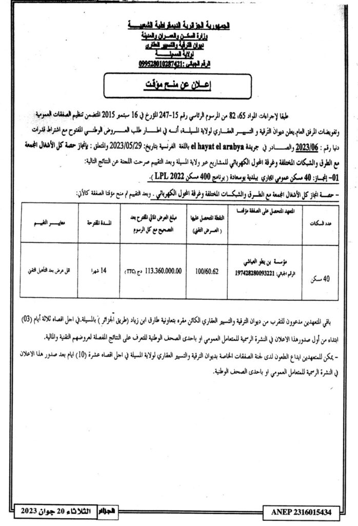 إعلان عن منح مؤقت: انجاز 40 مسكن عمومي ايجاري ببلدية بوسعادة/ ديوان الترقية والتسيير العقاري لولاية المسيلة