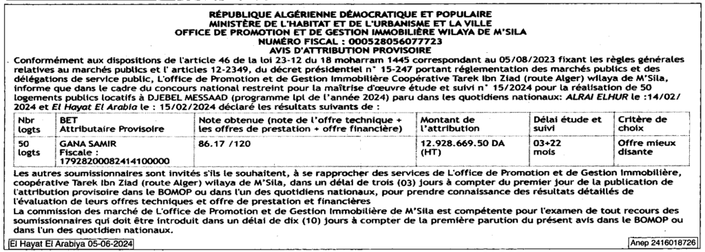 إعلان عن منح مؤقت: انجاز 50 مسكن عمومي ايجاري ببلدية جبل امساعد لسنة 2024/ ديوان الترقية والتسيير العقاري لولاية المسيلة