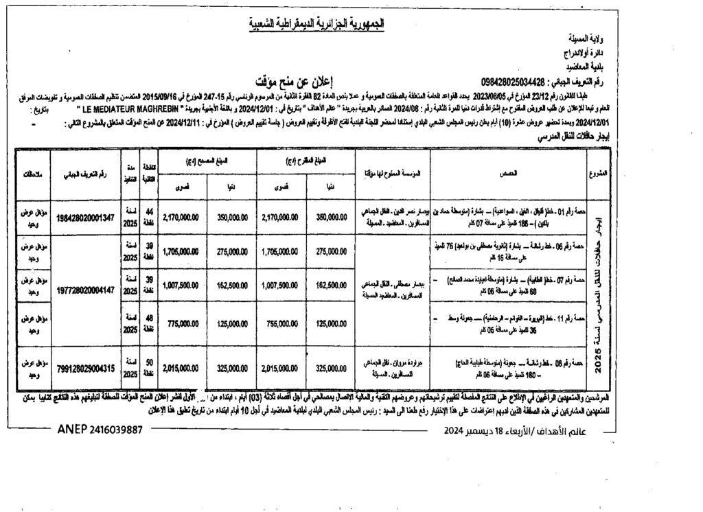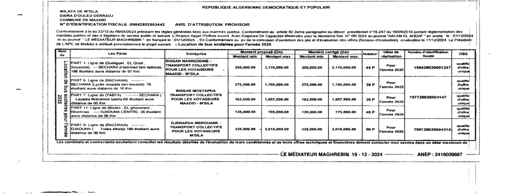 إعلان عن منح مؤقت ايجار حافلات للنقل المدرسي/ بلدية المعاضيد
