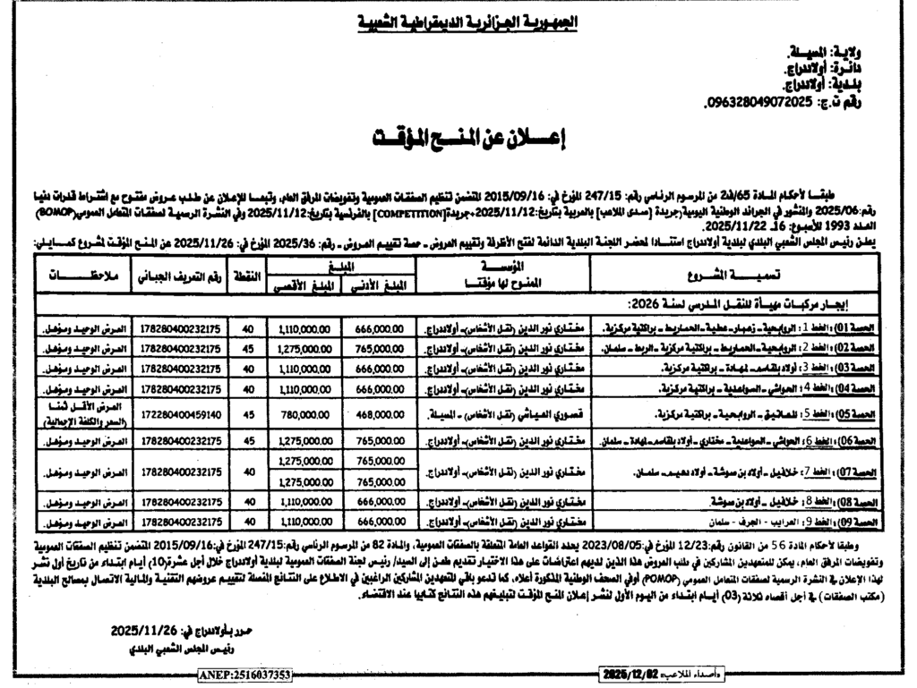 إعلان عن منح مؤقت ايجار مركبات مهيأة للنقل المدرسي لسنة 2026/ بلدية أولاد دراج
