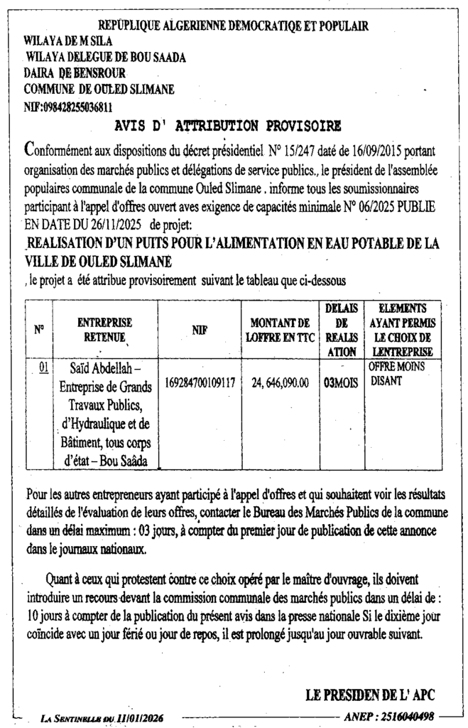 إعلان عن منح مؤقت/ بلدية أولاد سليمان