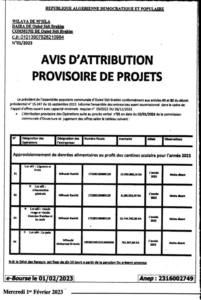 إعلان عن منح مؤقت/ بلدية أولاد سيدي ابراهيم
