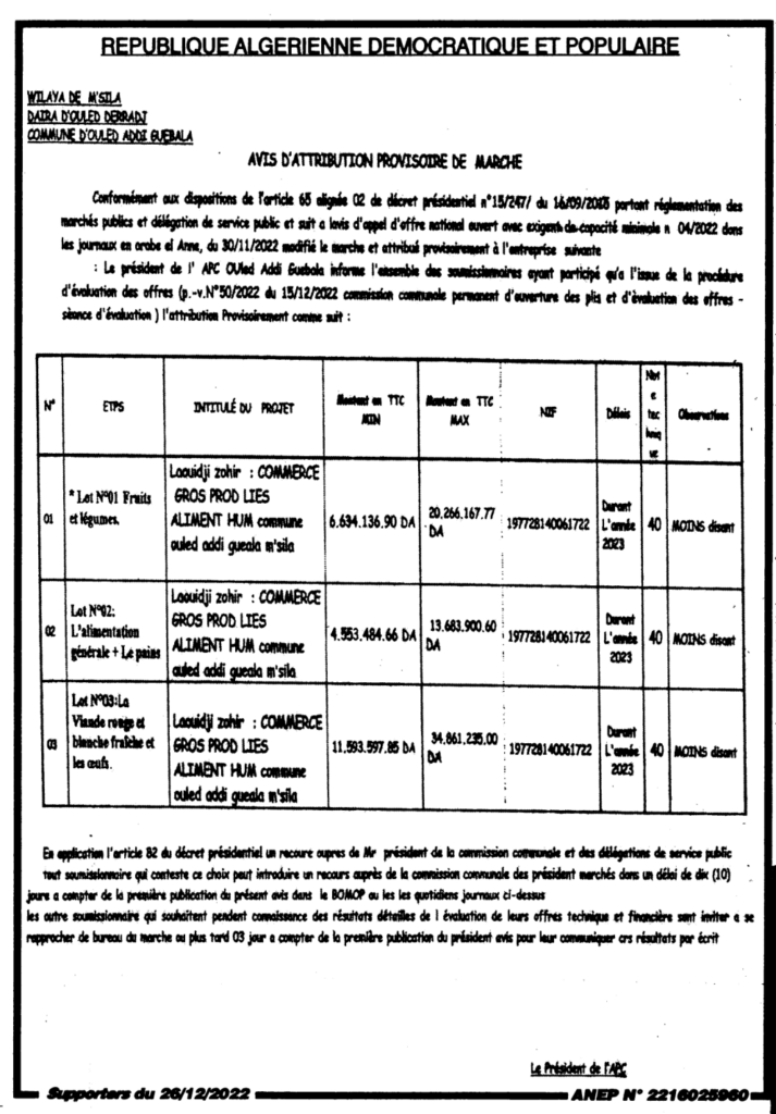 إعلان عن منح مؤقت بلدية أولاد عدي لقبالة
