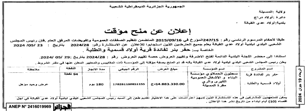إعلان عن منح مؤقت/ بلدية أولاد عدي لقبالة