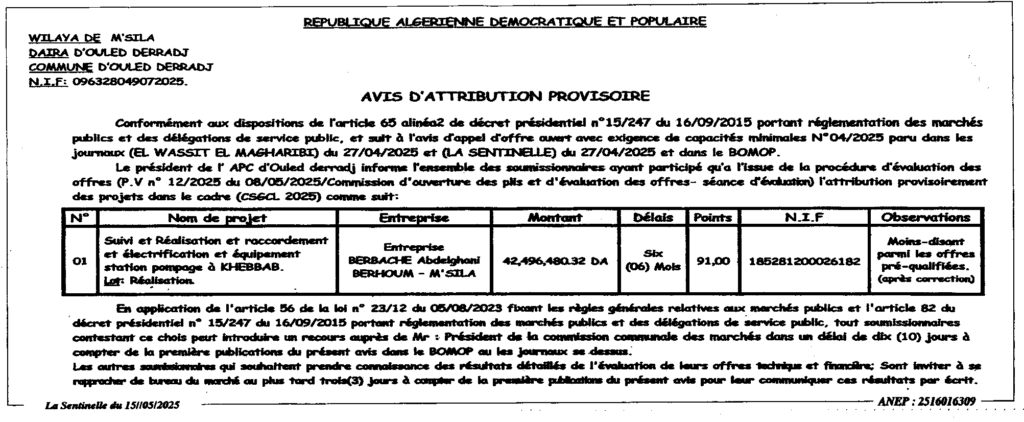 إعلان عن منح مؤقت/ بلدية أولاد عدي لقبالة