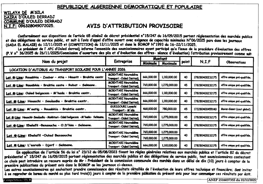 إعلان عن منح مؤقت/ بلدية أولاد عدي لقبالة