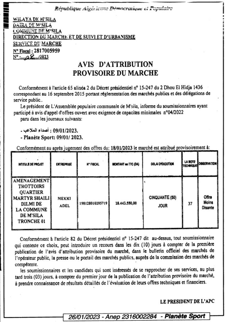 إعلان عن منح مؤقت/ بلدية المسيلة