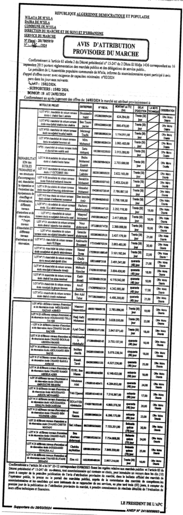 إعلان عن منح مؤقت/ بلدية المسيلة