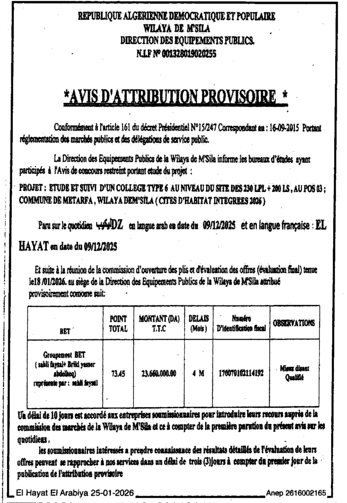 إعلان عن منح مؤقت بلدية المطارفة/ مديرية التجهيزات العمومية لولاية المسيلة
