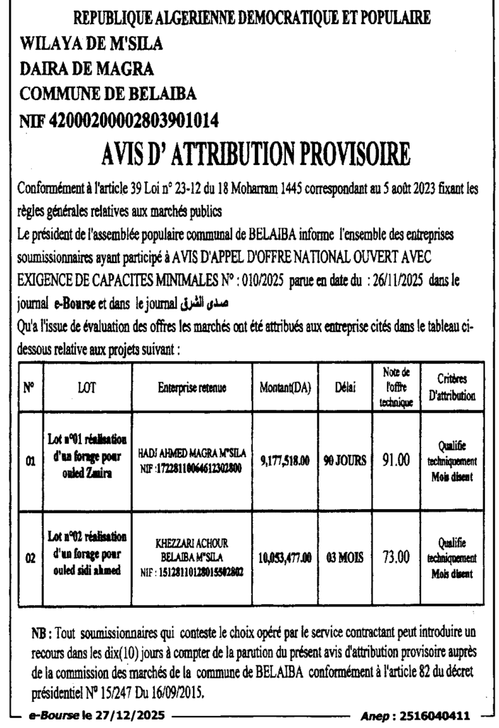 إعلان عن منح مؤقت/ بلدية بلعايبة