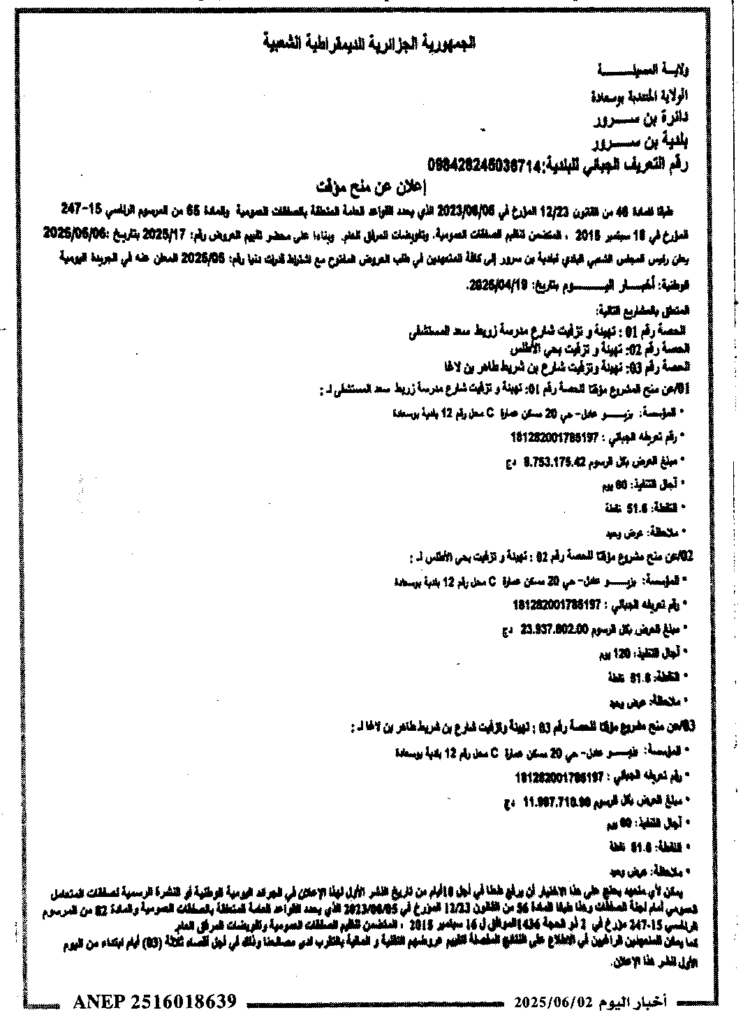 إعلان عن منح مؤقت/ بلدية بن سرور