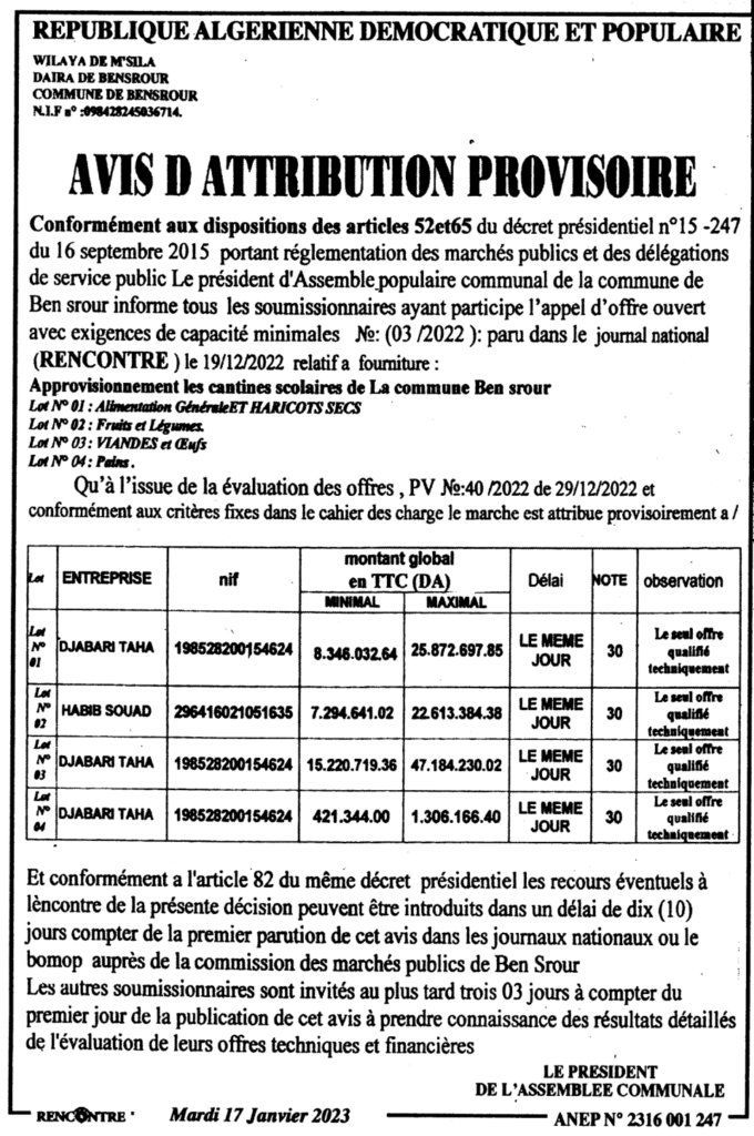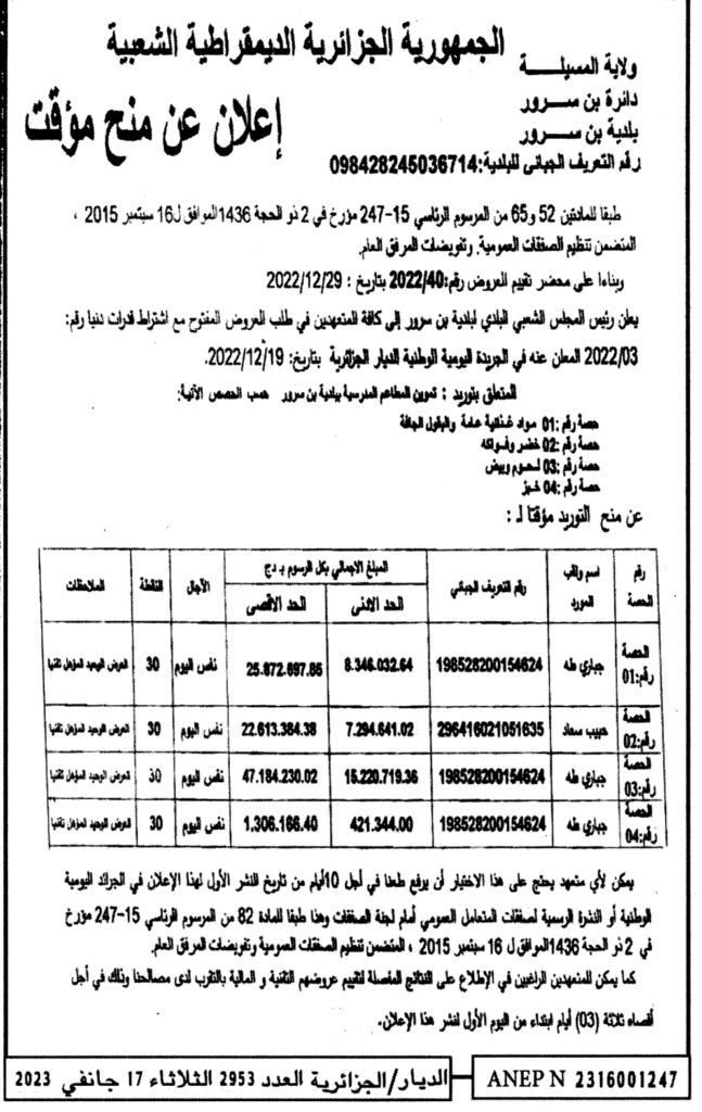 طلب عروض مفتوح مع اشتراط قدرات دنيا المتعلق بتوريد تموين المطاعم المدرسية ببلدية بن سرور17 يناير، 20230 35 شاركها فيسبوك X مشاركة عبر البريد طباعة