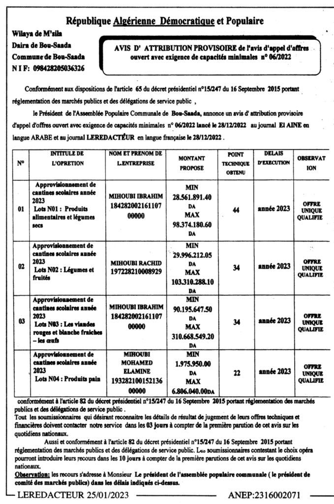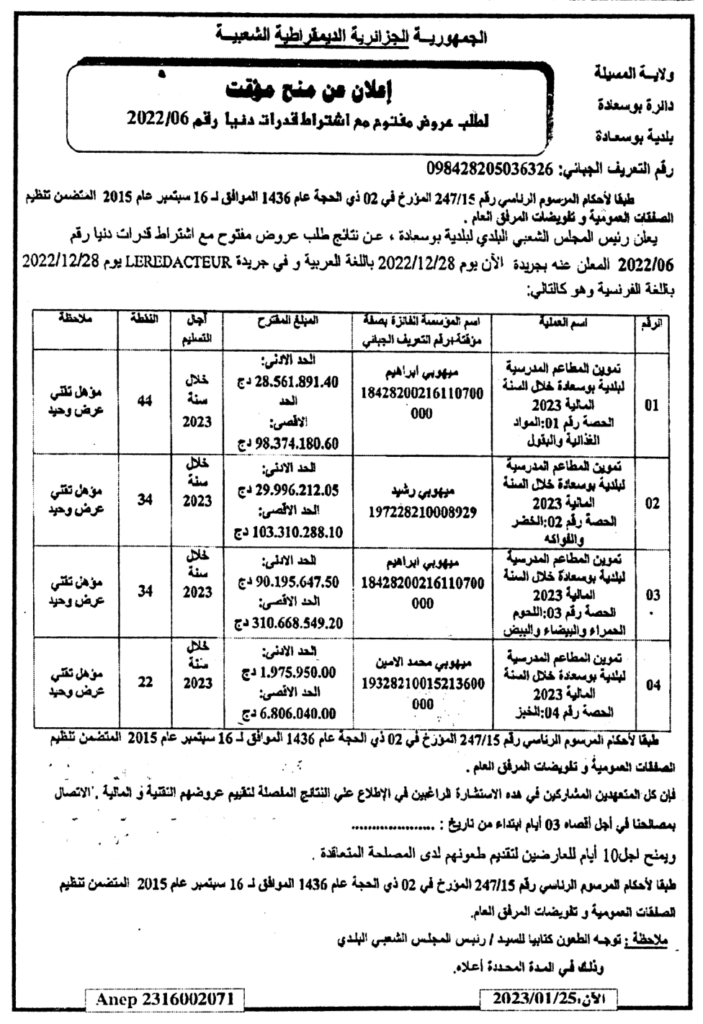 إعلان عن منح مؤقت/ بلدية بوسعادة