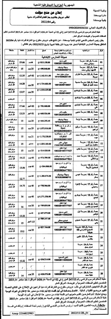 إعلان عن منح مؤقت 2022/04 بلدية بوسعادة