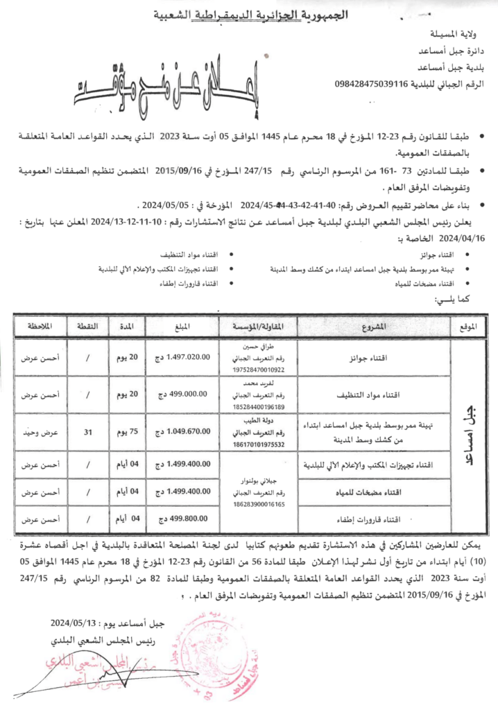 إعلان عن منح مؤقت/ بلدية جبل امساعد