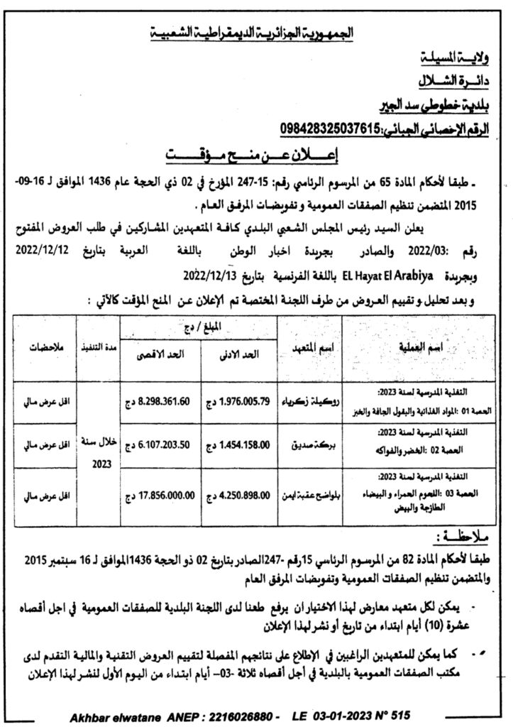 إعلان عن منح مؤقت/ بلدية خطوطي سد الجير