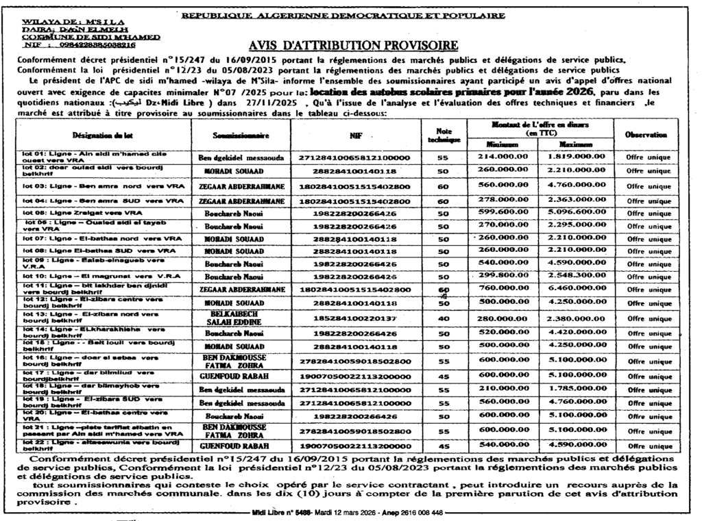 إعلان عن منح مؤقت/ بلدية سيدي امحمد
