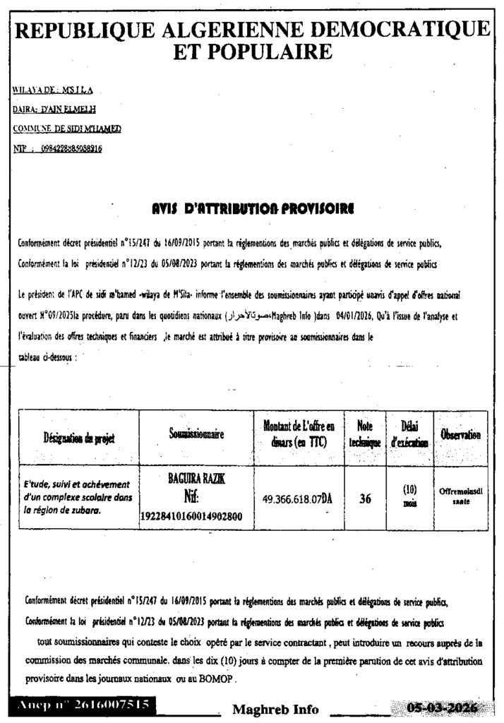 إعلان عن منح مؤقت/ بلدية سيدي امحمد