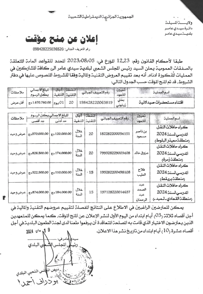إعلان عن منح مؤقت بلدية سيدي عامر