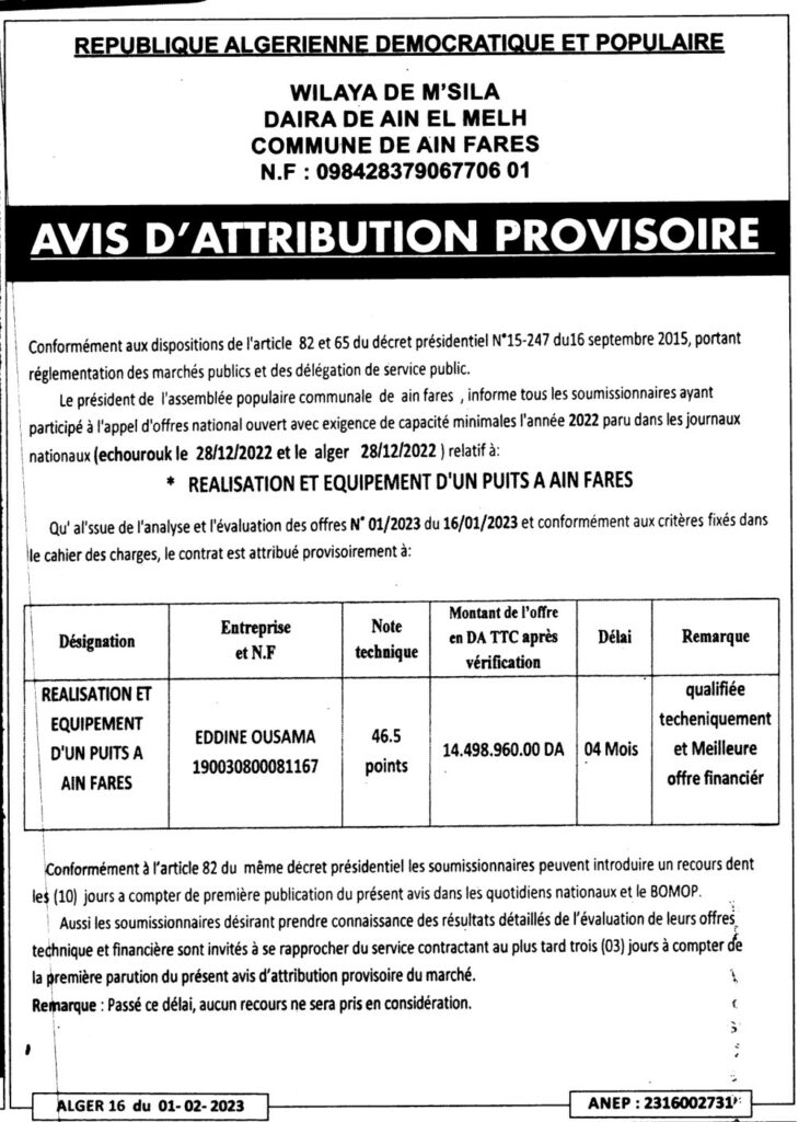 إعلان عن منح مؤقت/ بلدية عين فارس