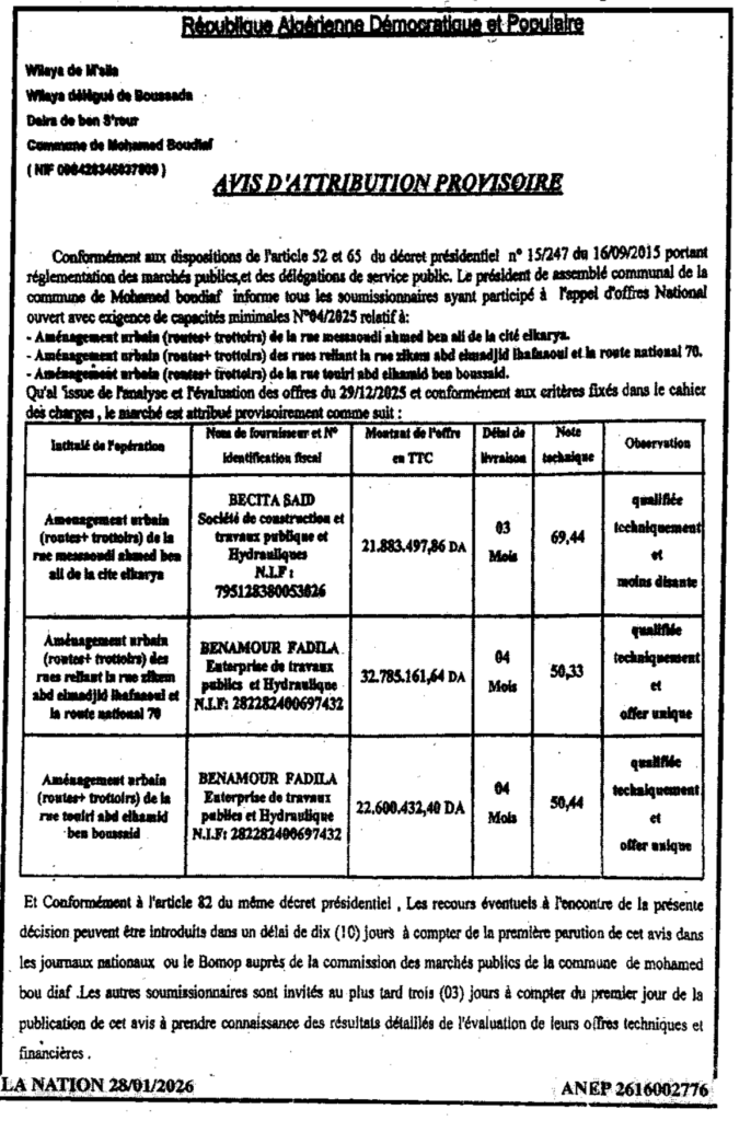 إعلان عن منح مؤقت/ بلدية محمد بوضياف