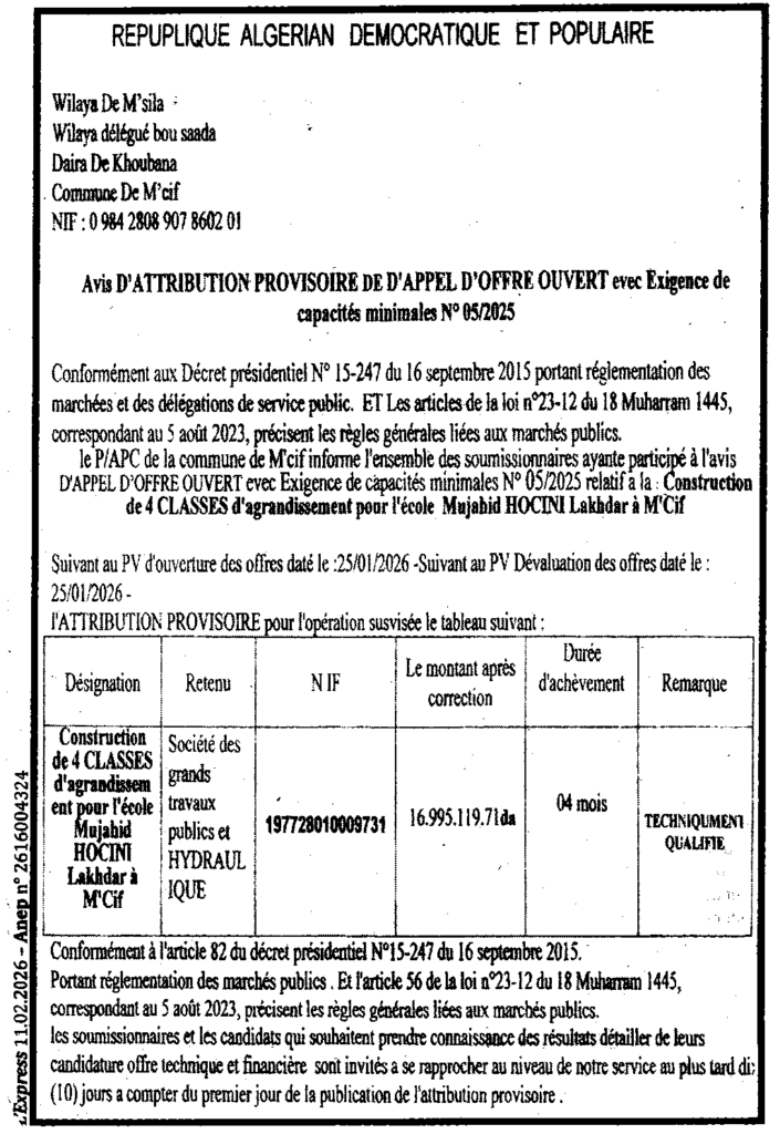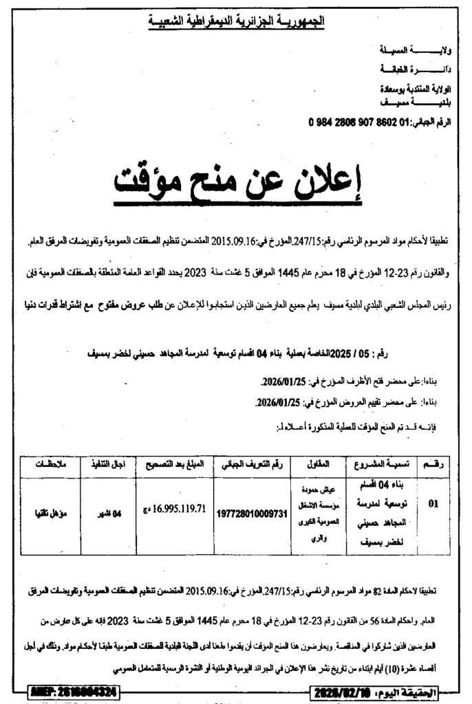 إعلان عن منح مؤقت بناء 04 أقسام توسعية لمدرسة المجاهد حسيني لخضر/ بلدية مسيف