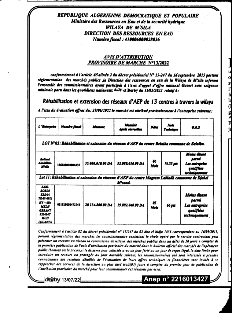 إعلان عن منح مؤقت: تأهيل وتوسيع شبكات إمدادات مياه الشرب مديرية الموارد المائية