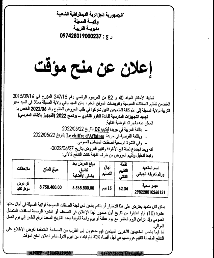 إعلان عن منح مؤقت: تجديد التجهيزات المدرسية لفائدة الطور الثانوي (برنامج 2022) التجهيز بالأثاث المدرسي مديرية التربية