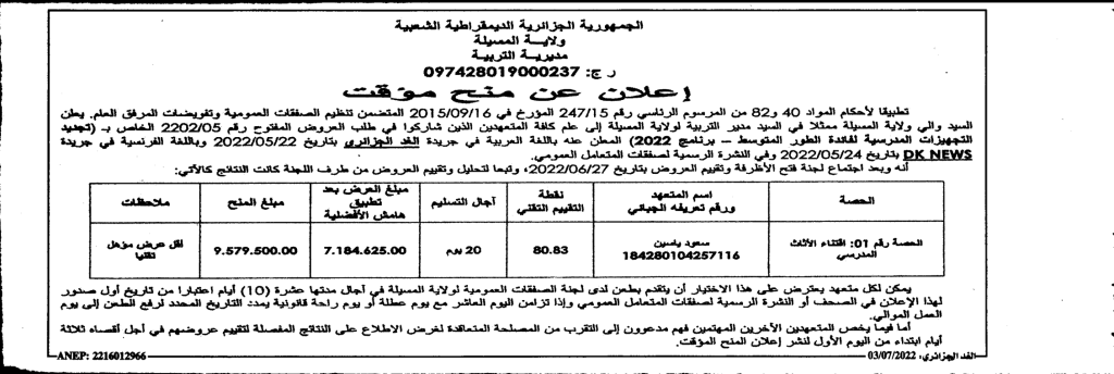 إعلان عن منح مؤقت: تجديد التجهيزات المدرسية لفائدة الطور المتوسط برنامج 2022 مديرية التربية