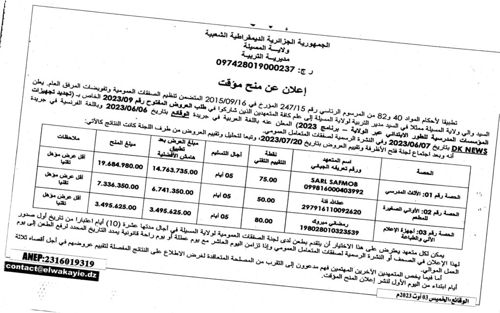 إعلان عن منح مؤقت: تجديد تجهيزات المؤسسات المدرسية للطور الابتدائي عبر الولاية برنامج 2023/ مديرية التربية لولاية المسيلة