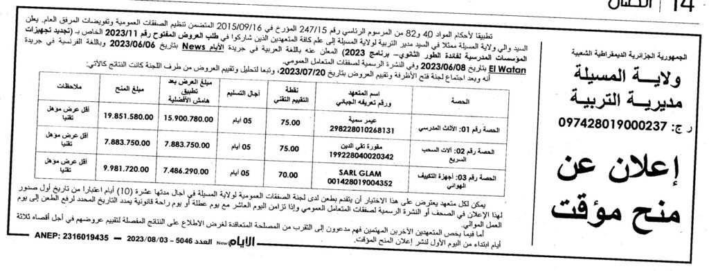 إعلان عن منح مؤقت: تجديد تجهيزات المؤسسات المدرسية لفائدة الطور الثانوي- برنامج 2023 مديرية التربية لولاية المسيلة