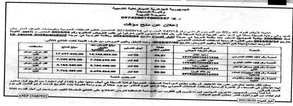 إعلان عن منح مؤقت: تجهيز ثانوية نمط 200/800 ببلدية السوامع مديرية التربية لولاية المسيلة