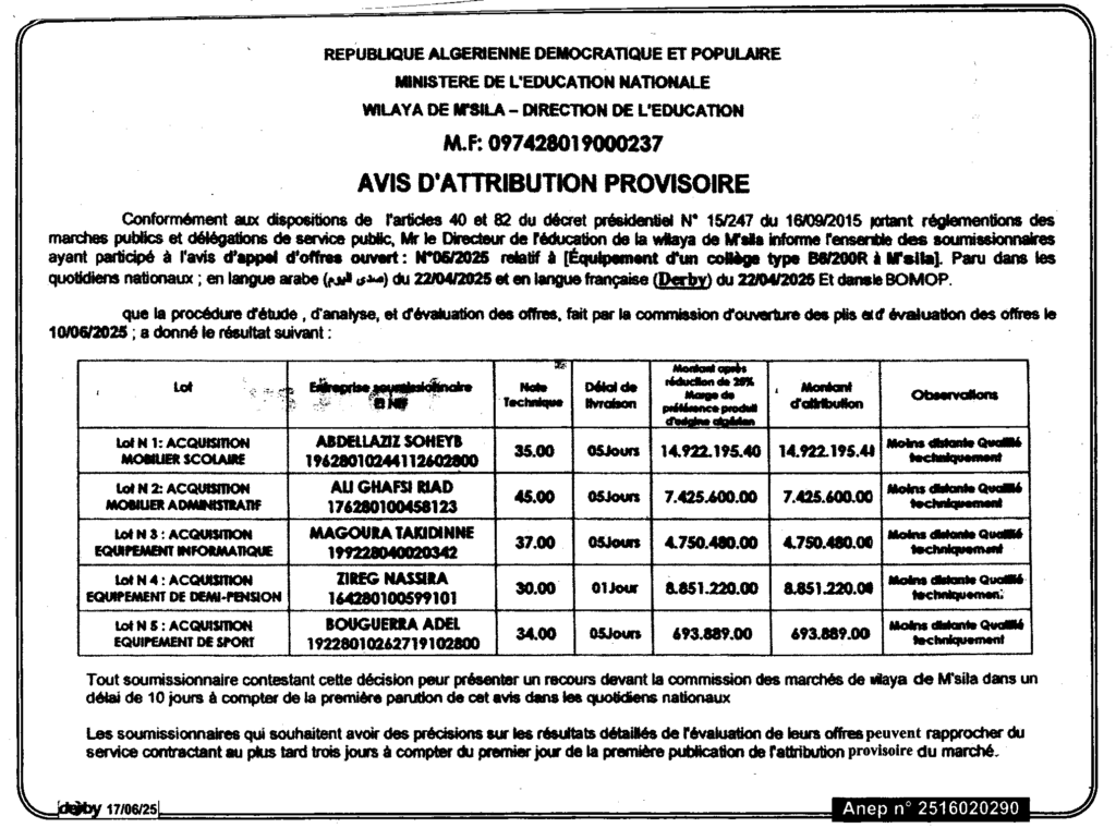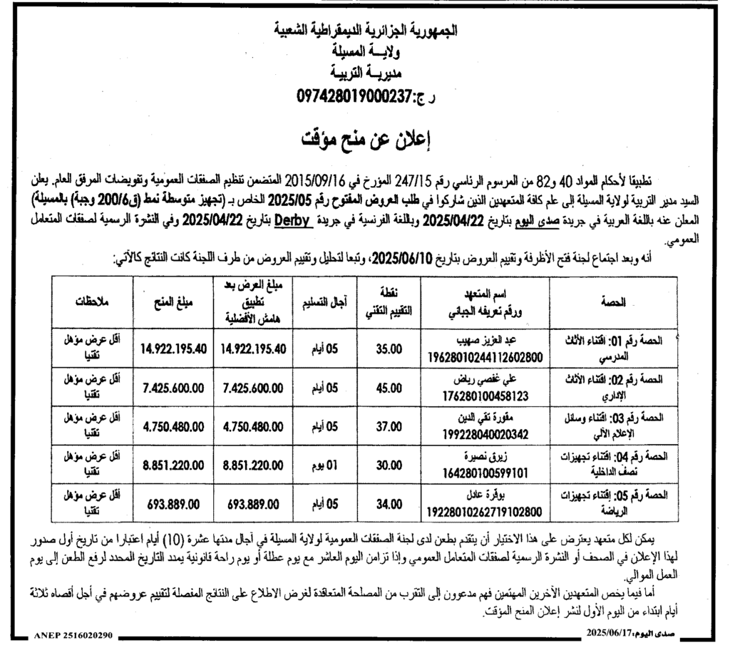 إعلان عن منح مؤقت تجهيز متوسطة نمط ق 200/6 وجبة بالمسيلة مديرية التربية لولاية المسيلة