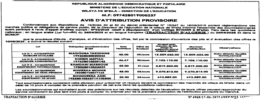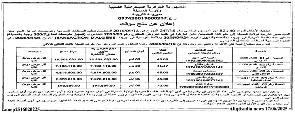 إعلان عن منح مؤقت تجهيز متوسطة نمط ق 300/7 وجبة بالمسيلة مديرية التربية لولاية المسيلة