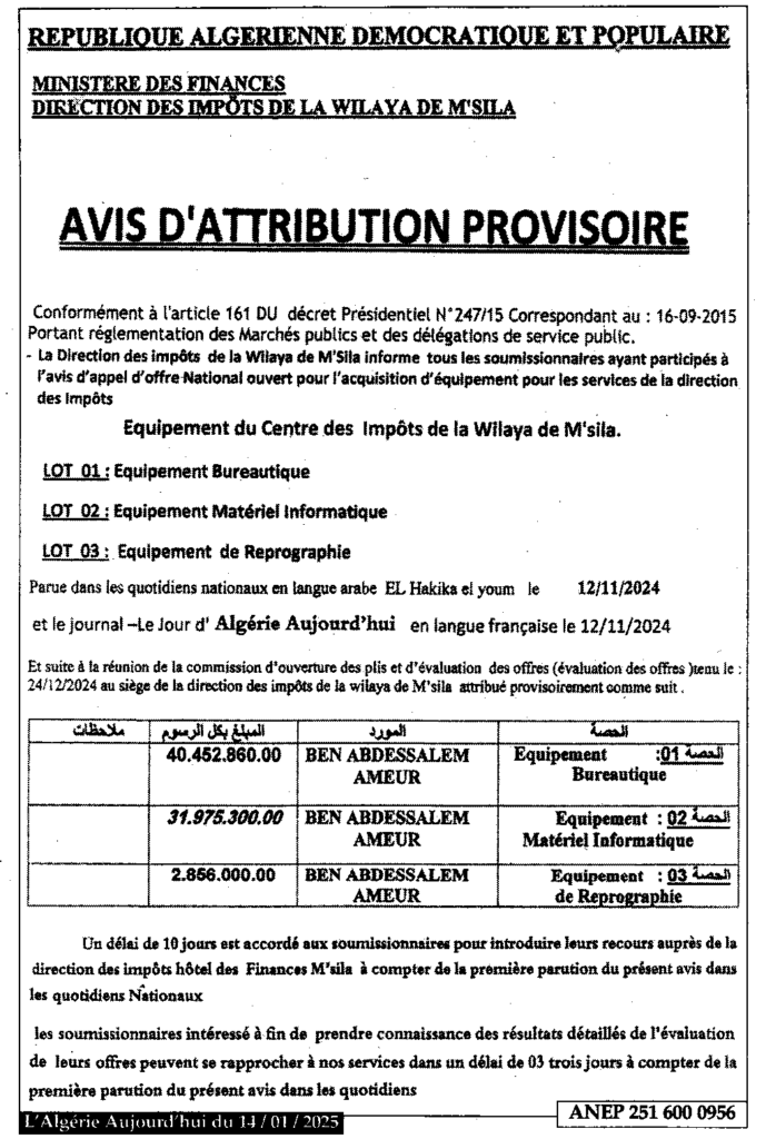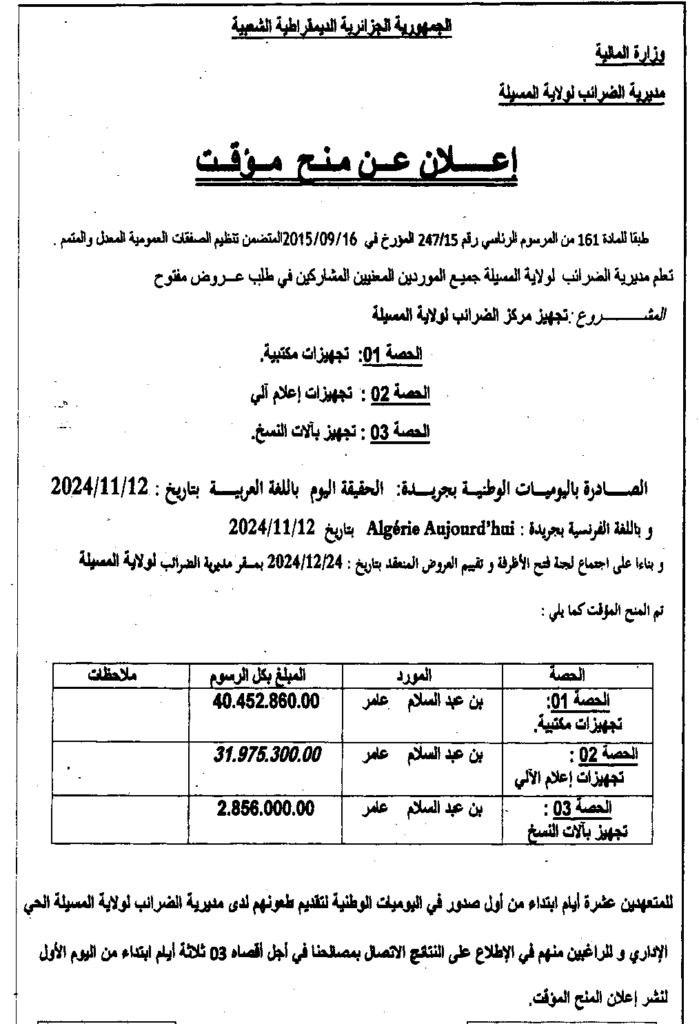 إعلان عن منح مؤقت تجهيز مركز الضرائب/ مديرية الضرائب لولاية المسيلة