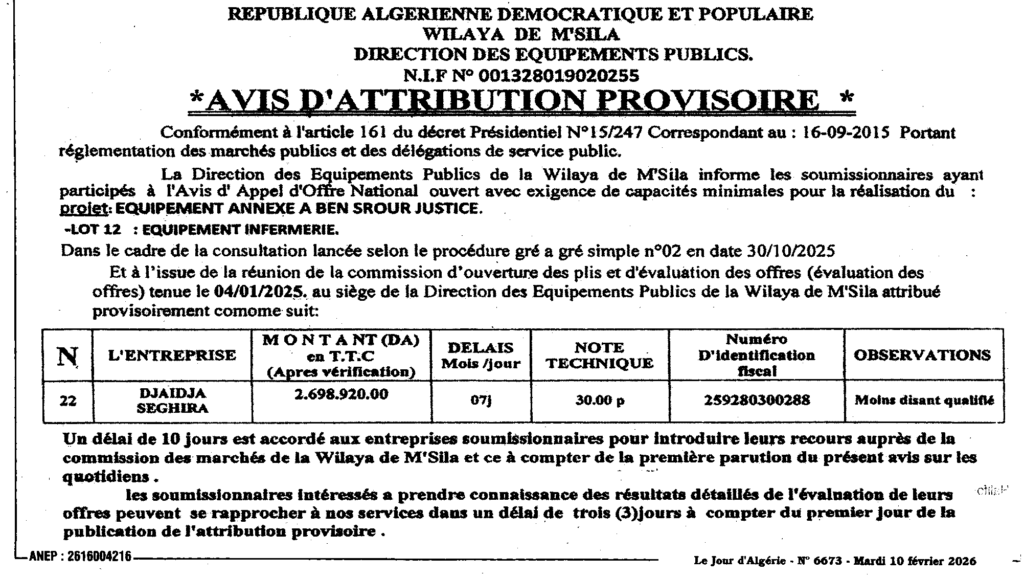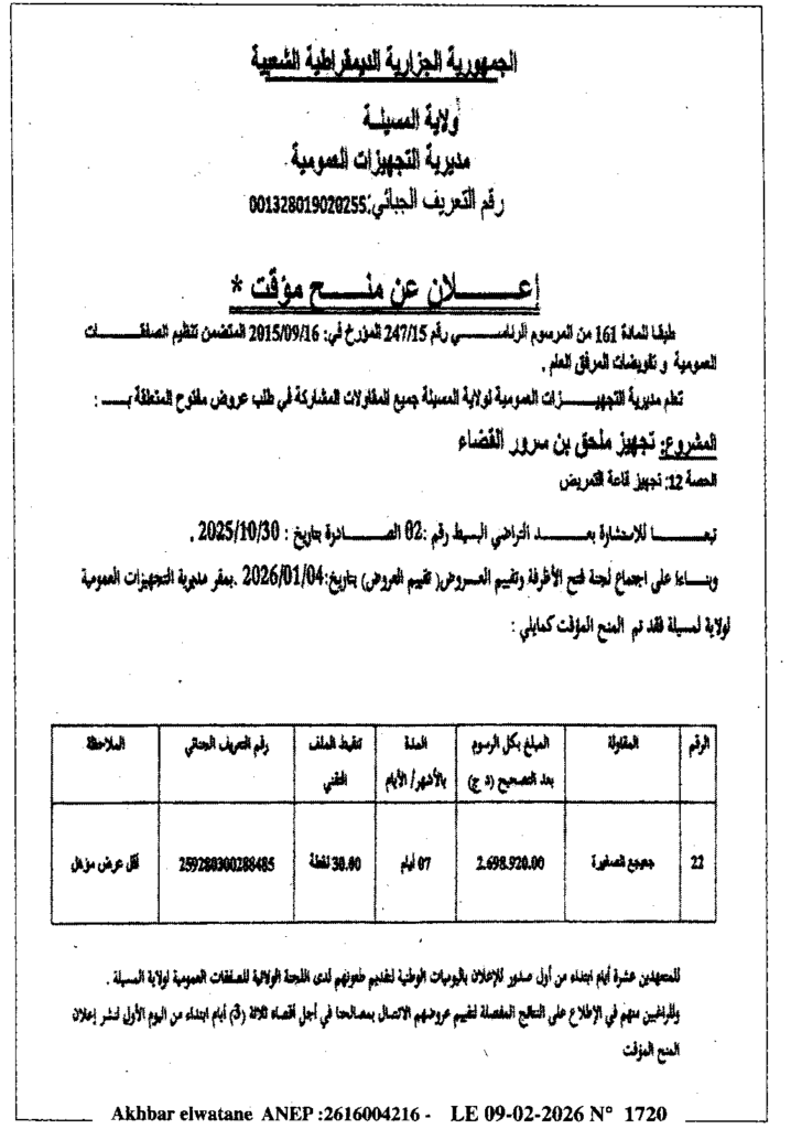 إعلان عن منح مؤقت تجهيز ملحق بن سرور/ مديرية التجهيزات العمومية لولاية المسيلة