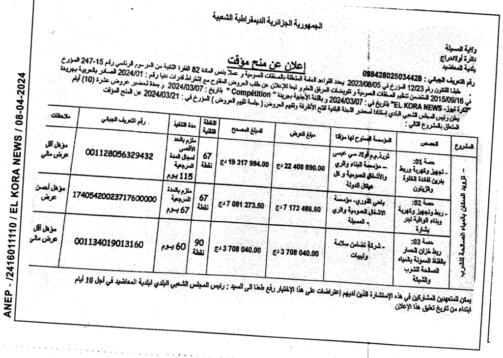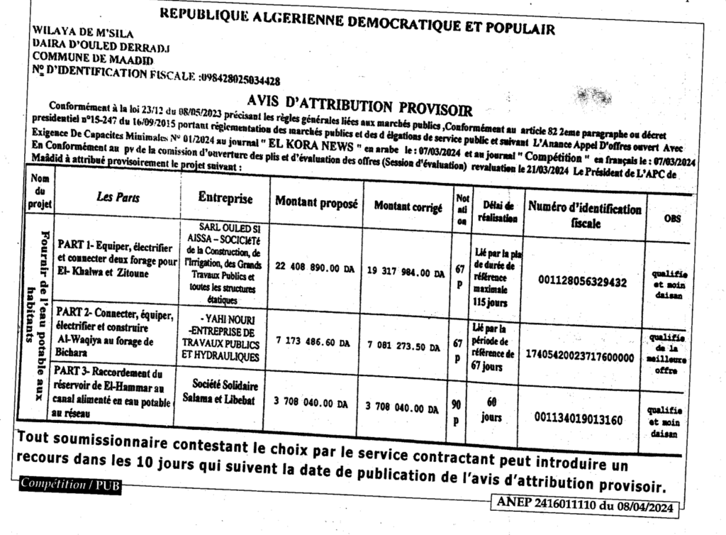 إعلان عن منح مؤقت: تزويد السكان بالمياه الصالحة للشرب/ بلدية المعاضيد