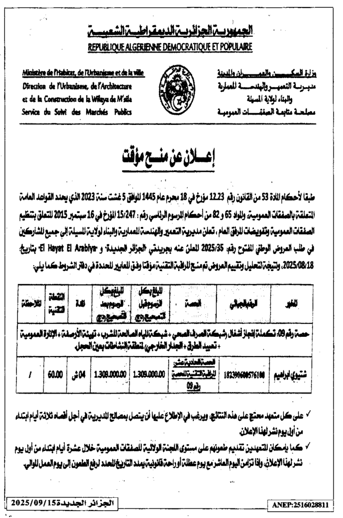 إعلان عن منح مؤقت تكملة انجاز أشغال بمنطقة النشاطات بعين الحجل/ مديرية التعمير والهندسة المعمارية والبناء لولاية المسيلة