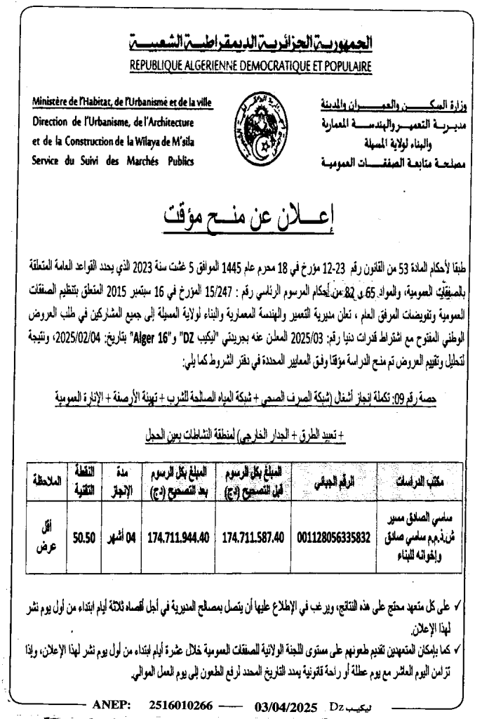 إعلان عن منح مؤقت تكملة انجاز أشغال لمنطقة النشاطات بعين الحجل/ مديرية التعمير والهندسة المعمارية والبناء لولاية المسيلة