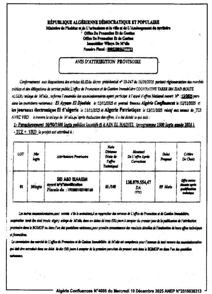 إعلان عن منح مؤقت تكملة انجاز 1500/90/50 مسكن عمومي ايجاريببلدية عين الحجل/ ديوان الترقية والتسيير العقاري لولاية المسيلة