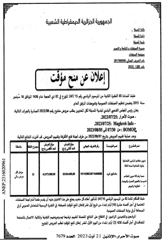 إعلان عن منح مؤقت: تموين المدارس الابتدائية بالمواد الغذائية لسنة 2023 بلدية المسيلة
