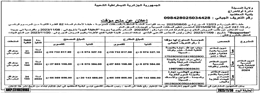 إعلان عن منح مؤقت: تموين المطاعم المدرسية الابتدائية بالمواد الغذائية لسنة 2024 بلدية المعاضيد