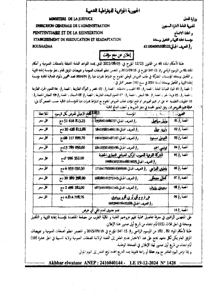 إعلان عن منح مؤقت تموين بالمواد الغذائية لسنة 2025 لفائدة مؤسسة إعادة التربية والتأهيل بوسعادة