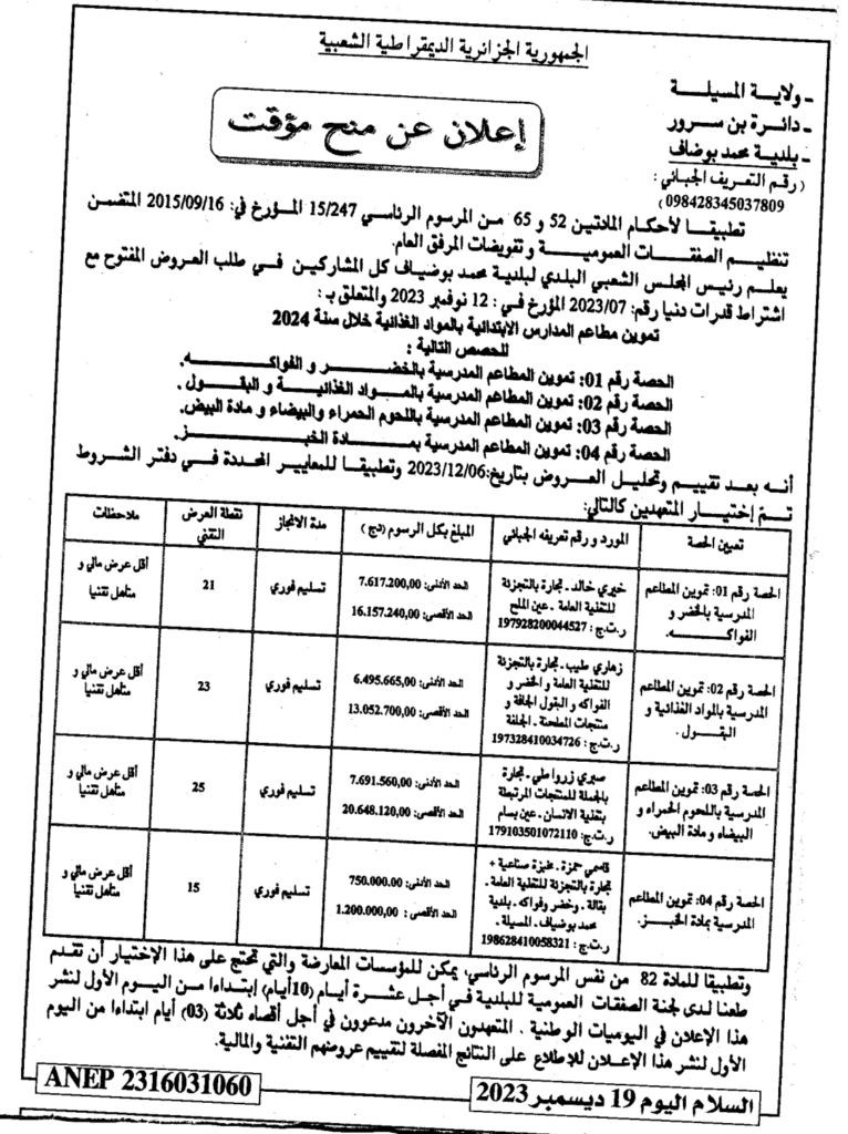 إعلان عن منح مؤقت: تموين مطاعم المدارس الابتدائية بالمواد الغذائية خلال سنة 2024/ بلدية محمد بوضياف