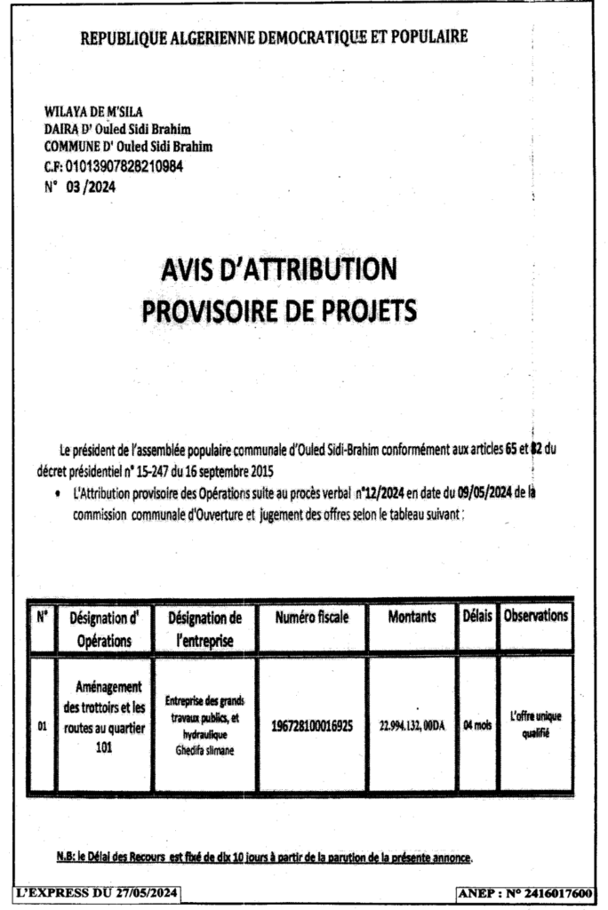 إعلان عن منح مؤقت تهيئة الأرصفة والطرق لحي 101 ببلدية أولاد سيدي ابراهيم