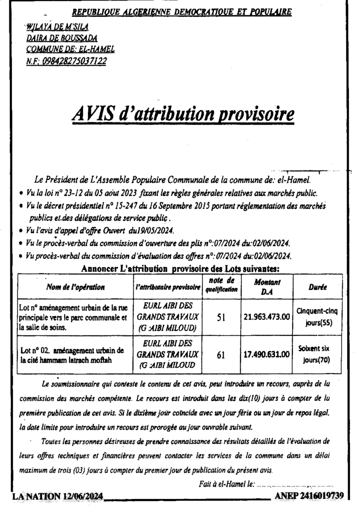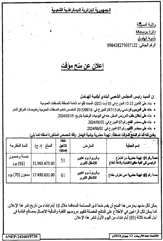 إعلان عن منح مؤقت تهيئة حضرية ببلدية الهامل