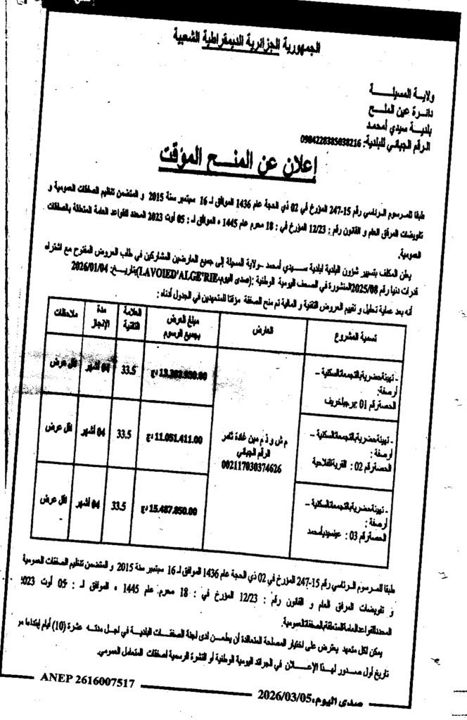 إعلان عن منح مؤقت تهيئة حضرية/ بلدية سيدي امحمد